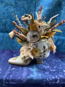 April Lucas will be exhibiting repurposed antiques, mushroom art assemblages and vintage tin vignettes.