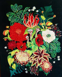 Sydney Bruner: Sydney Bruner is an artist based out of Champaign, IL. She primarily uses acrylic and oil paint. Her artwork focuses on topics of nature, nostalgia, pop culture, feminism, and introspection. She enjoys working with bright colors, glitter, rhinestones, and iridescent materials.